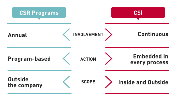 - CSI ต้องเป็นกิจกรรมที่ต่อเนื่อง ซึ่งนี่ต่างจาก csr ที่เป็นกิจกรรมประจำปีของบริษัท ไปปลูกป่า กันทุกปี ให้ทุนการศึกษากันทุกปี อย่างนี้เป็นต้น