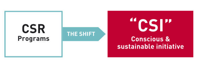 CSR จึงมีการกลายร่างให้เป็น “CSI” Conscious & Sustainable Initiative ซึ่งแบรนด์สามารถเลือกให้กลยุทธ์นี้ เพื่อสร้างความสัมพันธ์กับชุมชน กลุ่มเป้าหมาย ผู้ถือหุ้ม สื่อ และ ผู้มีส่วนได้ส่วนเสียกับแบรนด์ อันจะนำมาซึ่งความได้เปรียบจากการเป็น good citizen ของคอนซูมเมอร์ได้อย่างดี